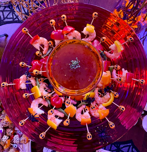 Embalmed Colossal Shrimp Skewers with Wilted Snap Peas & Assorted Peppers served with Thai Chili Sauce & Bloody Cocktail Sauce