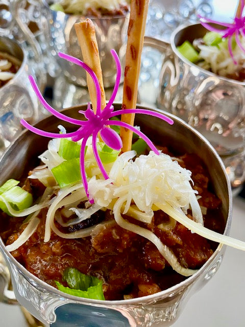Vampire Turkey Chili in Spider Cups with Monterey Jack Cheese & Bone Stix